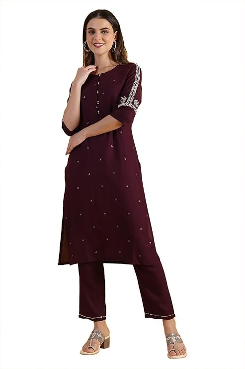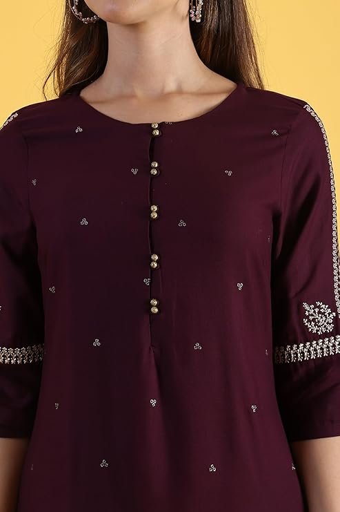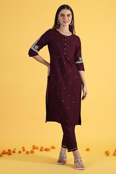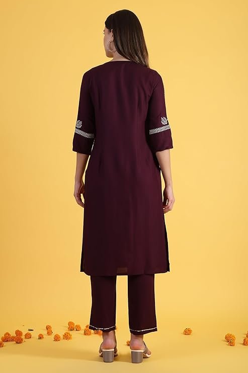 W for Woman Purple Embroidered Straight Kurta and Straight Pants Set.
