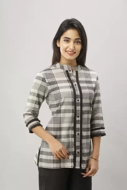 Women Regular Fit Checkered Mandarin Collar Casual Shirt.
