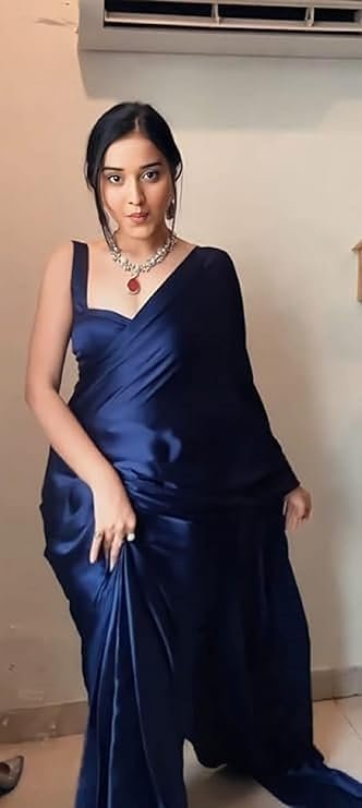 SHOPAZ Women’s Ready to Wear Plain Navy-Blue Satin Saree.