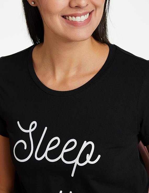 • It features round neck, short sleeves, placement print and curved hem detail