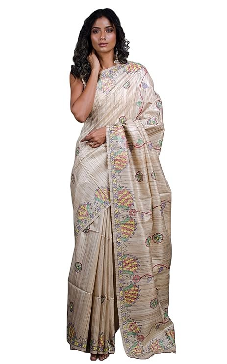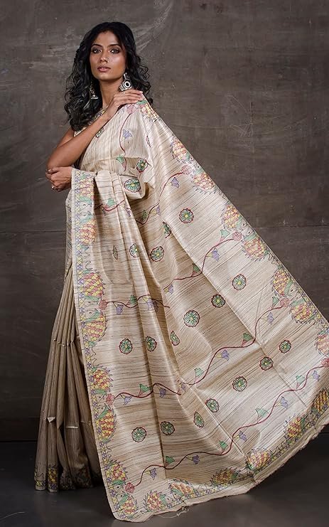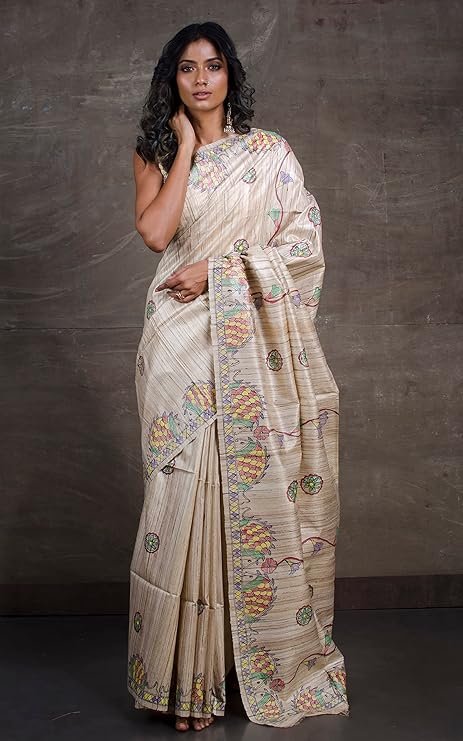 Indian Hand Paint Madhubani Saree Art on Pure Gicha Tussar Silk Saree
